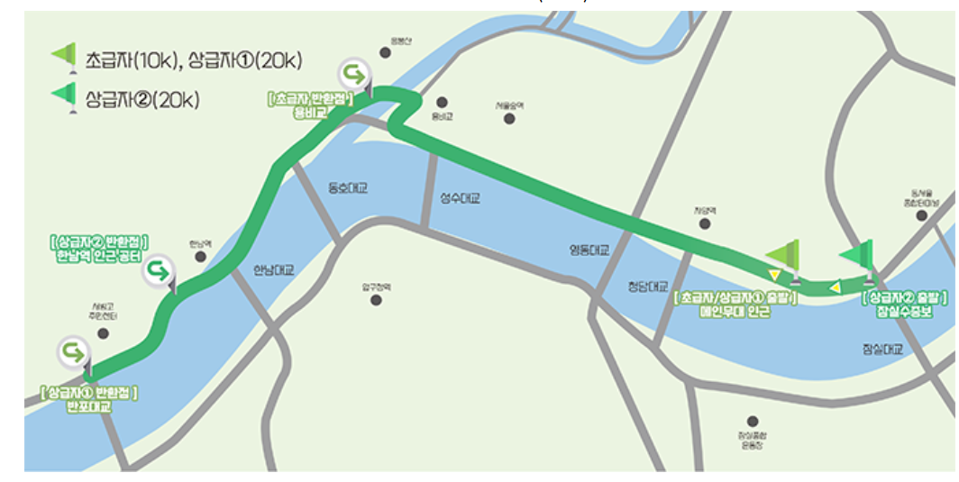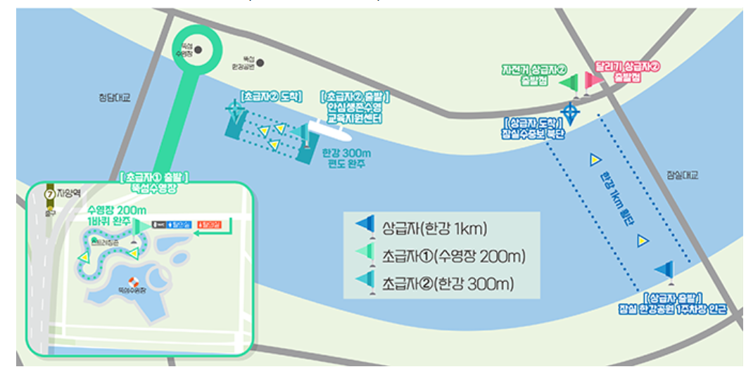 ● 수영 1km 참여 시 - 잠실수중보 북단 ~ 용비교 ~ 한남역 인근(반환)