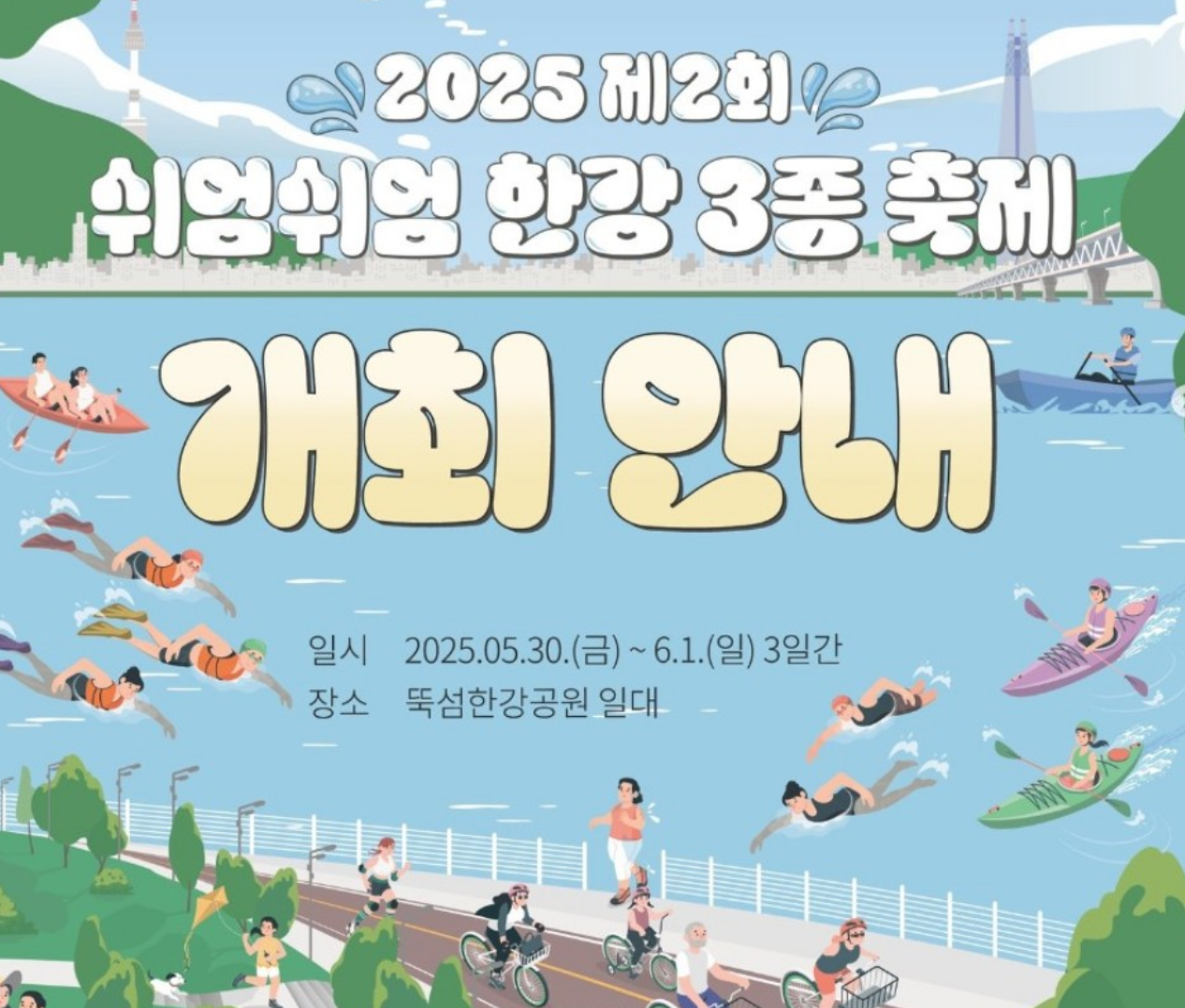 2025년 5월 30일부터 6월 1일까지 3일간 한강에서 직접 달리고, 자전거 타고, 헤엄칠 수 있는 쉬엄쉬엄 한강 3종 축제에 대한 접수를 2월 26일 오후 2시부터 선착순으로 2만 명에 한해 예약 신청받고 있으니 관심 있는 분들은 빠르게 신청하세요~~
