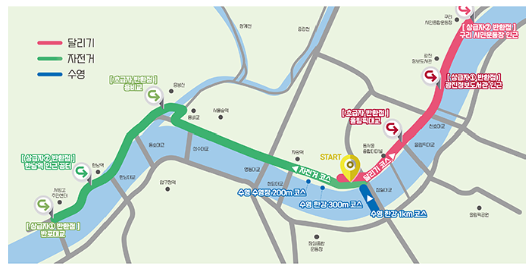 ● 수영 1km 미참여 시 - 자연학습장 인근 ~ 올림픽대교 ~ 광진정보도서관 인근(반환)