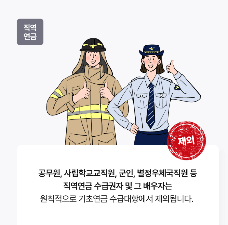 기초연금 제외 대상자는 아래와 같은 연금 수급권자와 배우자는 원칙적으로 기초연금을 받으실 수 없습니다.