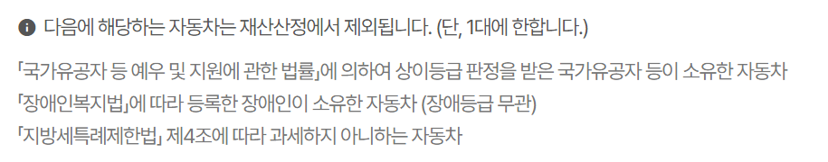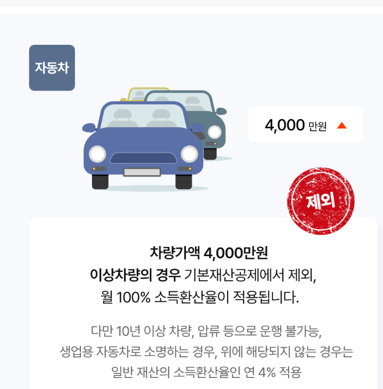 차량가액 4,000만 원 이상의 승용차, 승합차 또는 이륜차 보유 시 기본재산공제대상에서 제외되며 월 100%의 소득환산율이 적용됩니다.